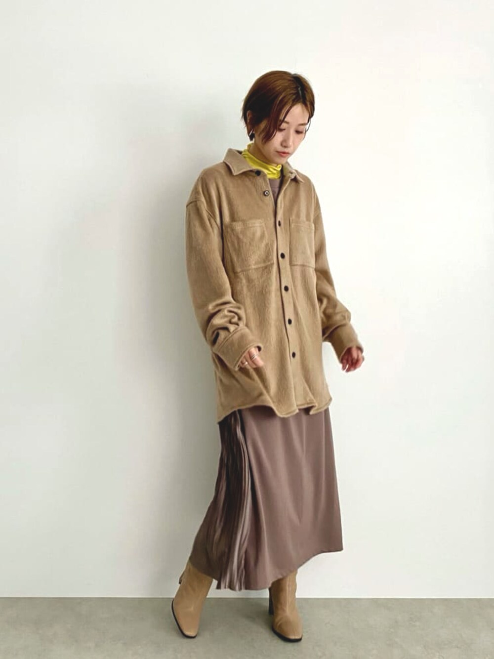 ユニセックスで着られるシャギーシャツアウターに、ワンピをレイヤードして女性らしいコーデに。 インナーにイエローのハイネックカットソーを合わせて、ほんのりモードな雰囲気にまとめました!