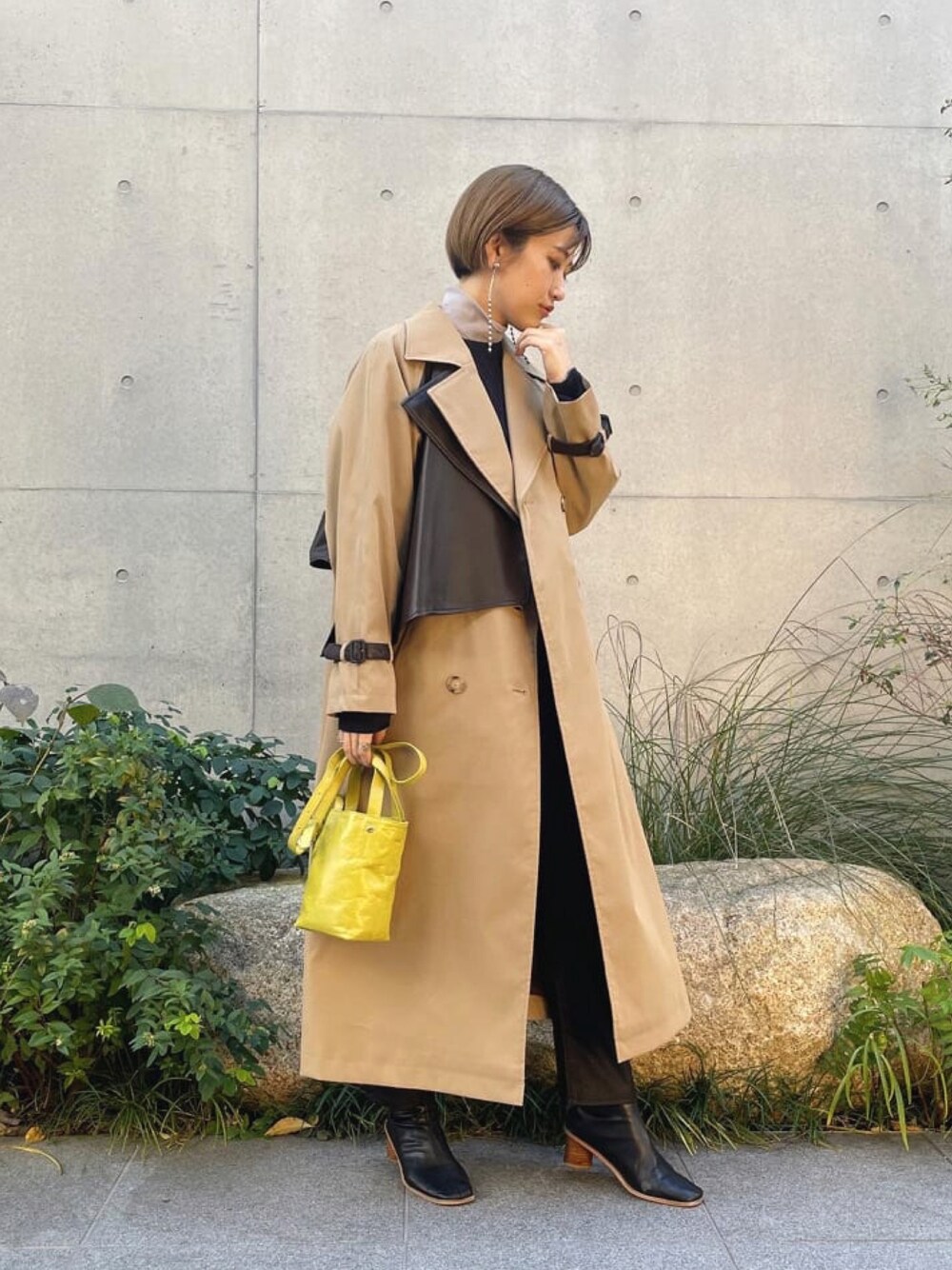 kyon(LOVELESS 本社)のトレンチコート「レザーレイヤー オーバーコート」を使ったコーディネート