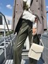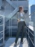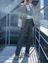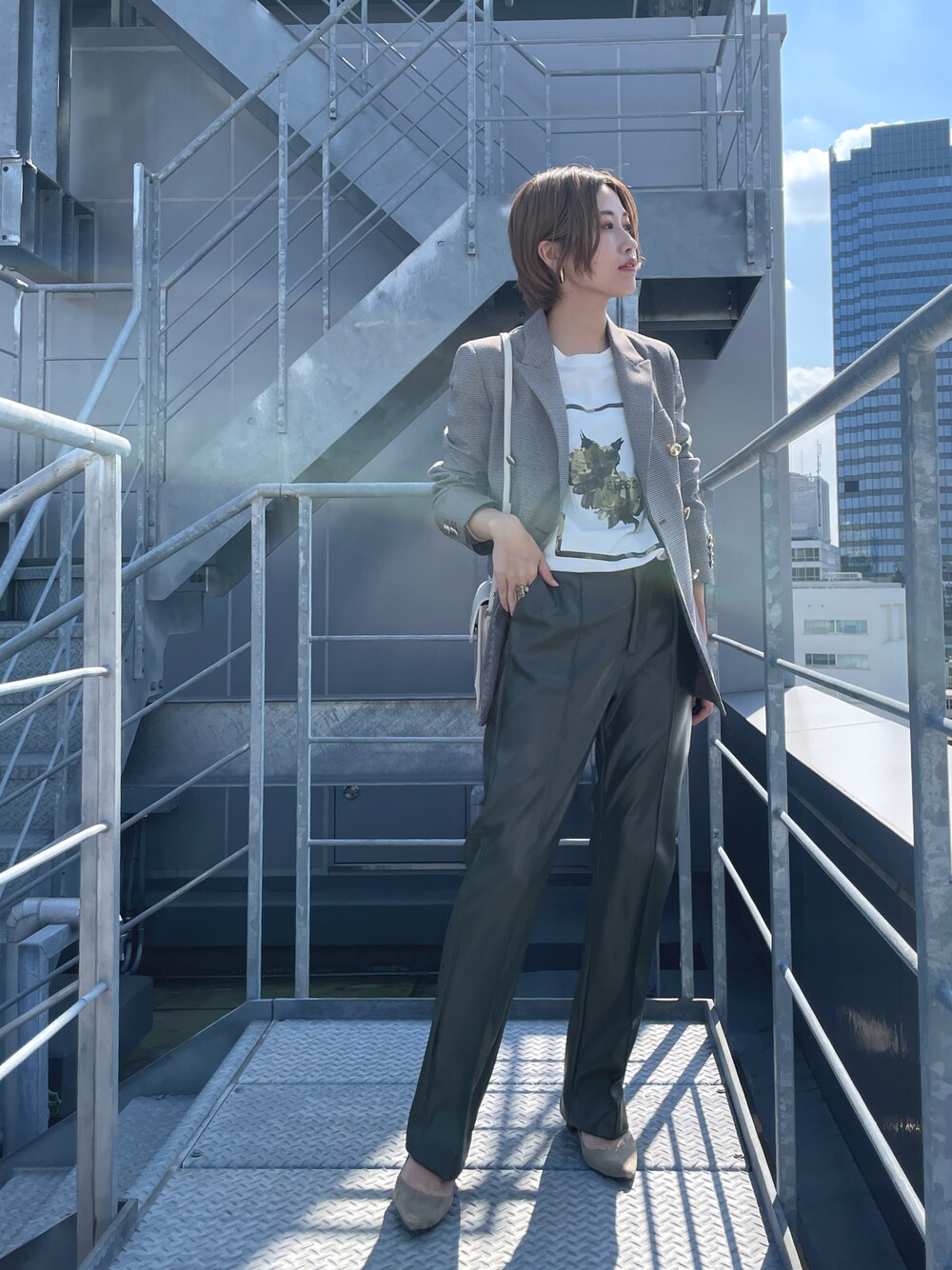 人気のチェックジャケットは、レザーパンツ×ロンTでほどよくモードカジュアルな雰囲気に。 ジャケットは、肩先で高く反りあがった肩のラインのデザインでよりマニッシュな印象に仕上がります。 足元はパンプスで少し女性らしくまとめるのが◎