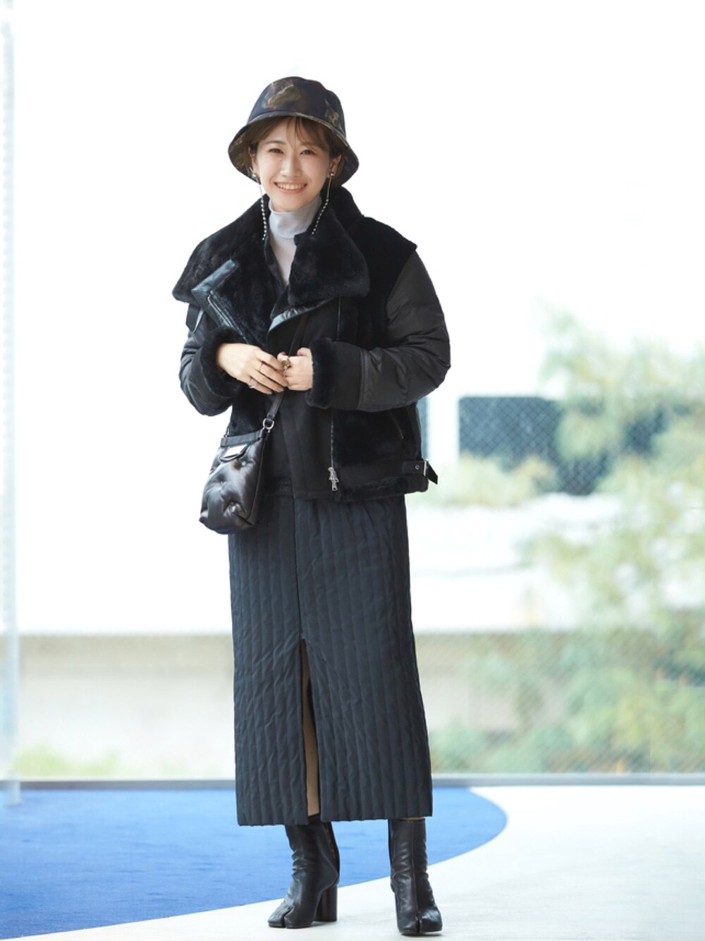 真冬のブラックコーデ! 人気のエコファーコンビラーダースダウンは、軽くて着心地も抜群。 キルティングのワンピースと合わせても異素材なので、全身ブラックでも重たく見え過ぎないようにバランスをとりました☺︎