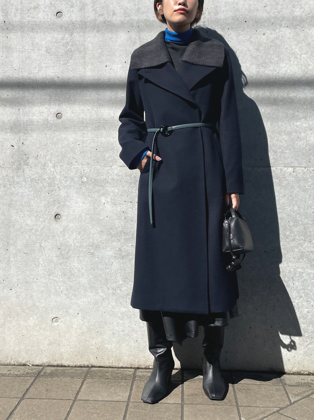 スタンドカラーとしても着用できる、ニット衿付きのスタイリッシュなウールコートをメインにした、上品レディスタイル♪ インナーにはブルー×グレーのバイカラーニットで、さりげなくカラーを取り入れて。 襟の印象で印象を変えられるコートは着回し力抜群です!