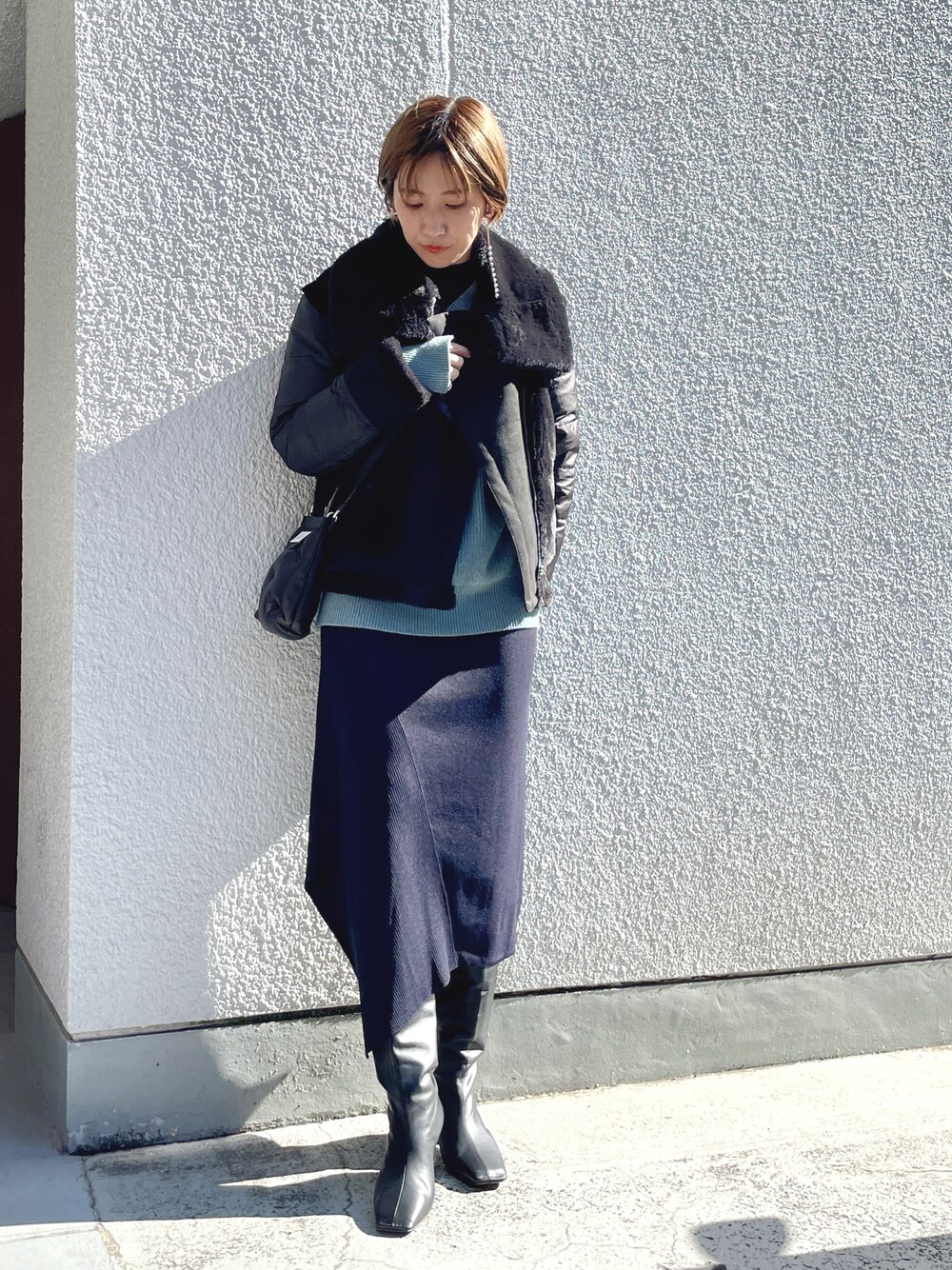 ムートンとダウンを組み合わせたかのようなライダースジャケットはボリュームがあるので、タイトなボトムスを選ぶとバランス良く着こなせます♪ ロングブーツを合わせてIラインを意識したシルエットで女性らしさをプラス。 寒色でまとめた、モード感を醸し出した大人カジュアルスタイルの完成!