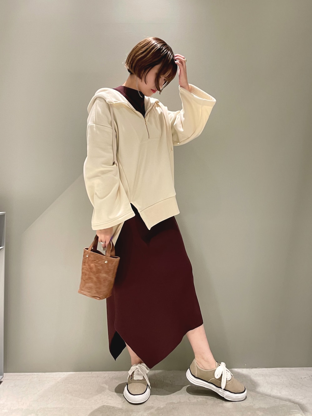 裏起毛で肌触り抜群のプルオーバーにアシンメトリーなニットワンピースを合わせた、大人カジュアルスタイル! 足元のスニーカーとミニバッグはブラウン系で合わせて。 スポーティーながら柔らかい色合いだとワンピースとの相性も◎