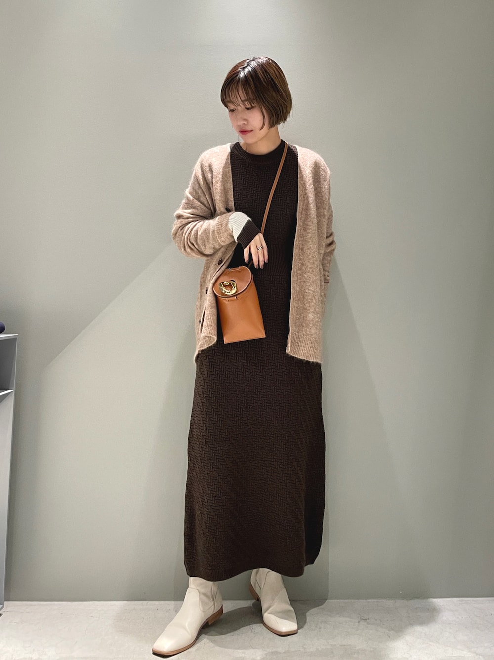着心地が楽ちんでも手抜き感が出ないのは断然ブラウンのワントーンコーデ! ゆったりとしたデザインのカーディガンは、袖口が配色になっているので手元のオシャレさも演出してくれます☺︎ 足元はホワイトブーツで軽く見せるのが今年のポイントです!