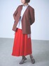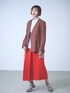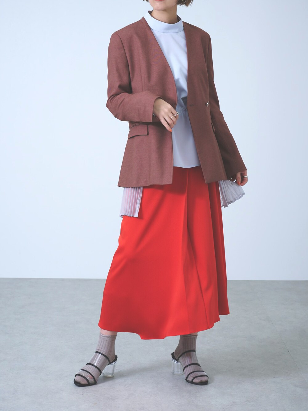 きれい見えするノーカラージャケットは、今年のカラースカートとの組み合わせがオススメです! インナーにスタンドカラーのブラウスを合わせると、ぐっとモードな印象に。 サンダル×靴下の足元で、コンサバになりすぎないジャケットスタイルの完成!