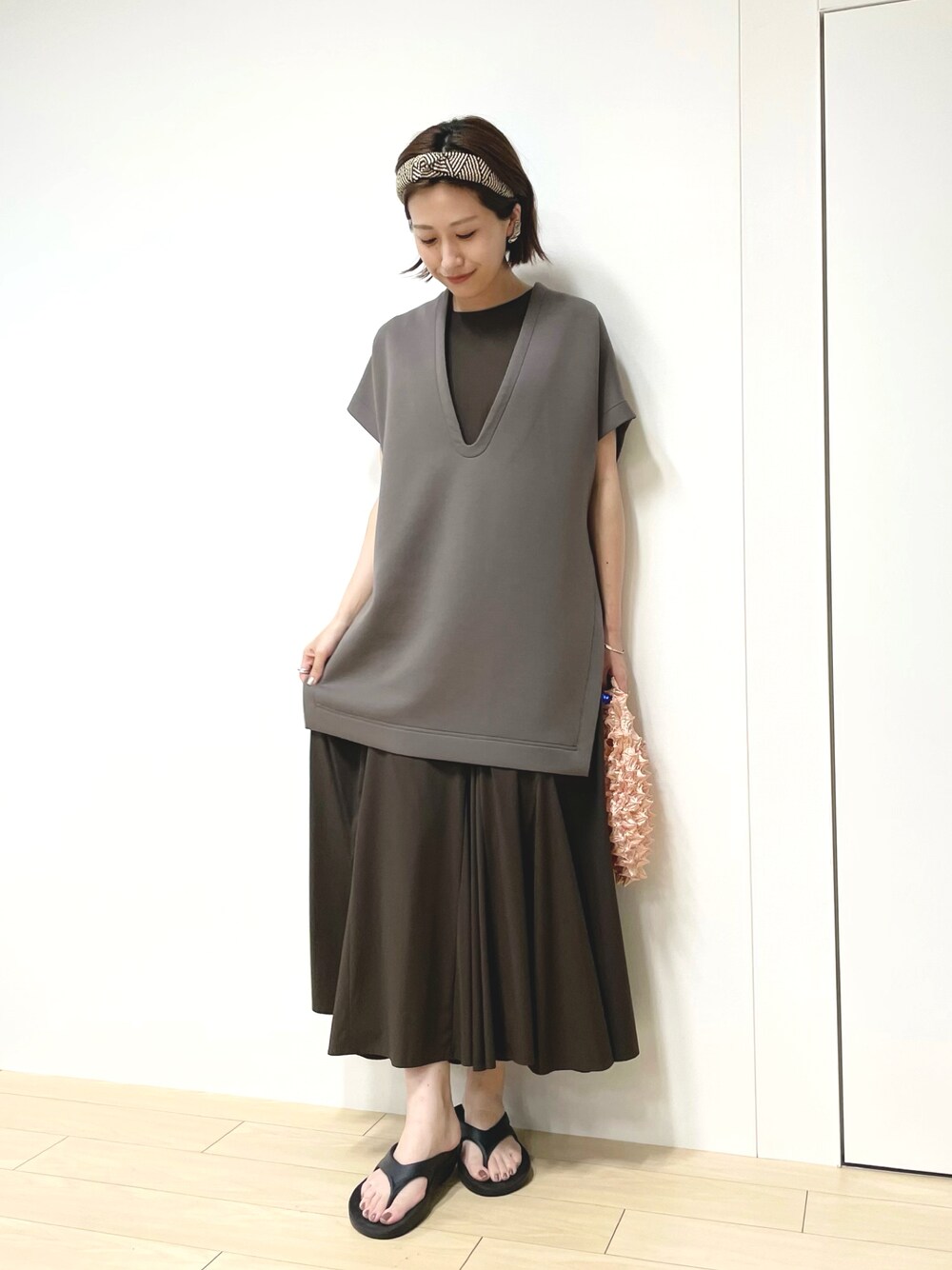 秋のアースカラースタイル! ノースリーブのワンピもベストとのレイヤードで、初秋にもぴったりな雰囲気に早変わり。