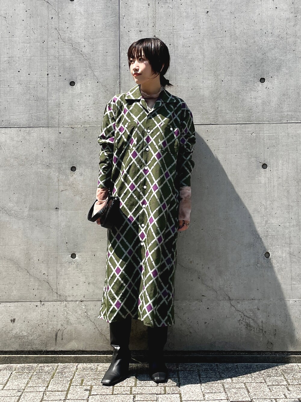 光沢感のある素材にシックな配色のアーガイルが映える、ボックスシルエットのシャツワンピース。 カジュアル要素は残しつつ、タイダイ柄のチュールトップスとのレイヤードで柄×柄でうるさくなりそうなスタイルも、ブーツやバッグをブラックで引き締める事で大人モードな印象に。