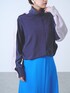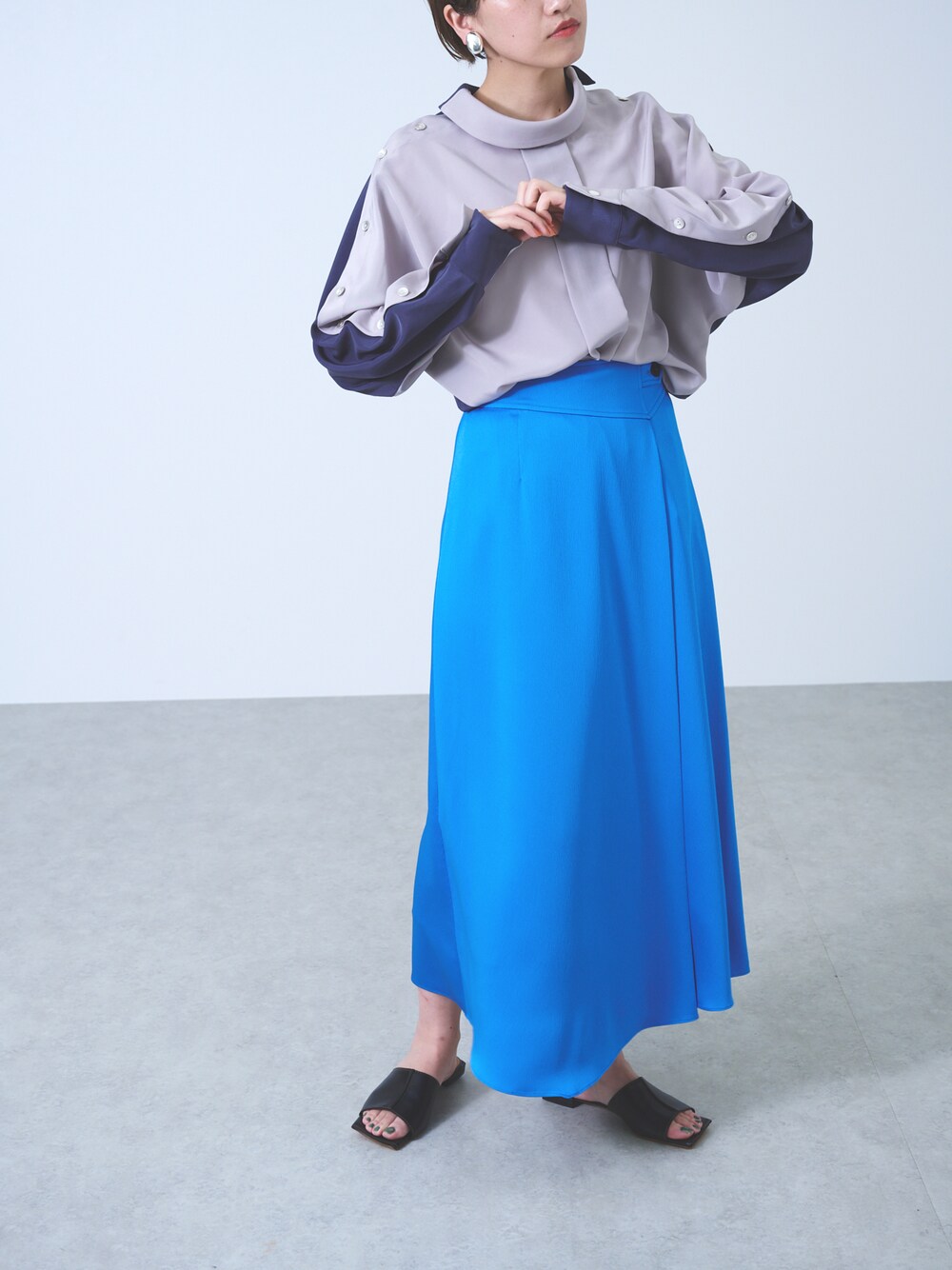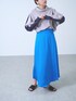 21AWで好評だった、バイカラーの配色がキャッチーかつ、前後で着用できる2WAYブラウス! ブルーの鮮やかなスカートと合わせて、モードなスタイルにまとめました。