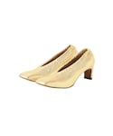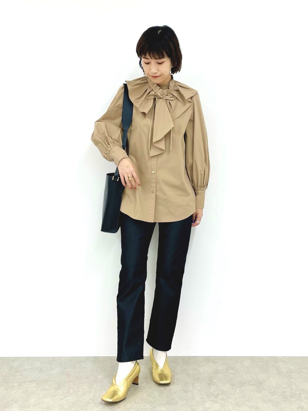 ラッフル襟が特徴的なブラウスは、デニム見えパンツでラフに着こなすと甘くなりすぎなくて◎ ゴールドパンプス+ソックス合わせで程よく大人カジュアルにまとめてみました☺︎