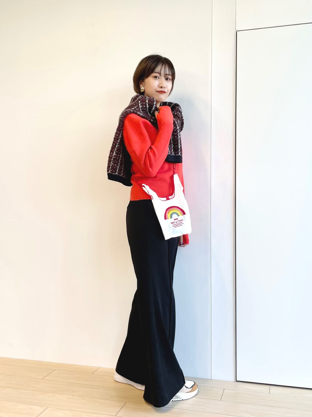 構築的なスリーブデザインが特徴のプルオーバーニットに、ツイード見えのニットジャケットをサラッと肩巻きしたカジュアルスタイル! ボトムをブラックにする事で締まった印象に。 デニムなどではなくパンツはキレイめを選ぶと大人の程よいカジュアル感を出せます!