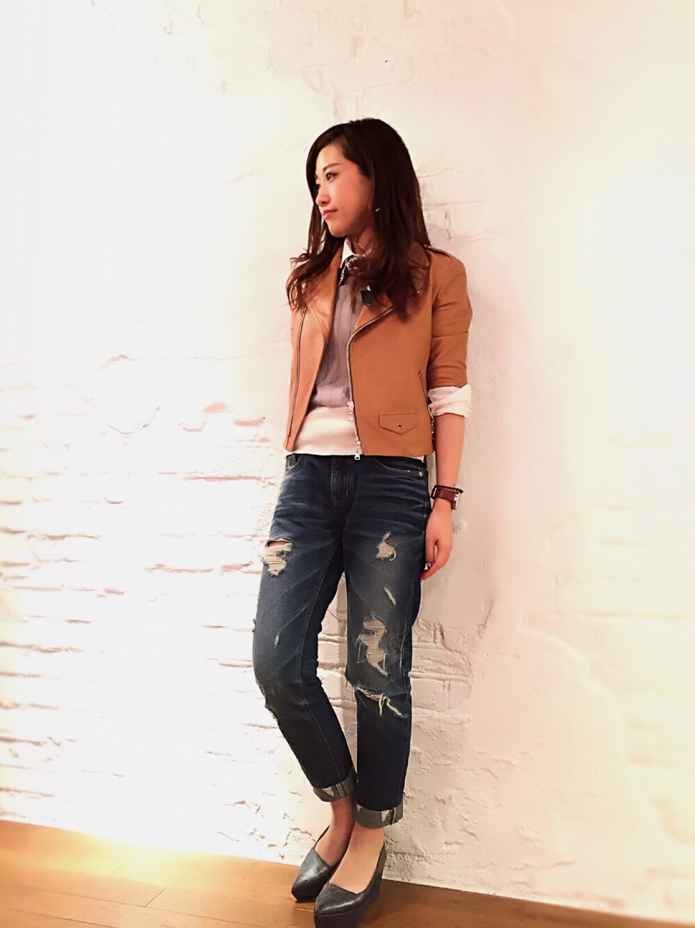 今年らしいレイヤードスタイル! ノースリーブニット×シャツ×ライダースに、バンダナをプラスして、ポイントに🎶