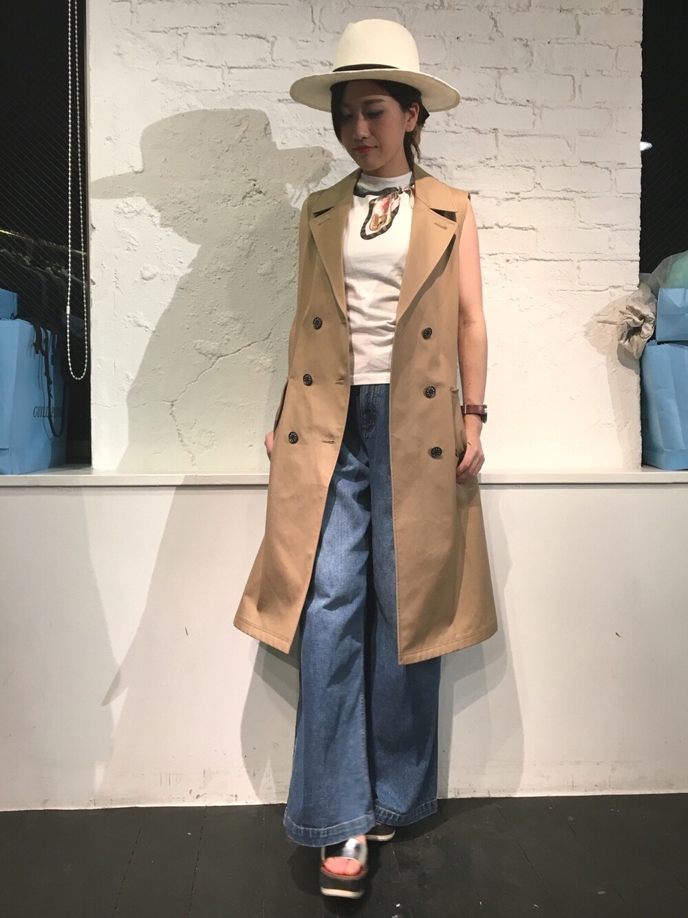 ノースリーブトレンチにワイドデニムで、旬なロングコーデに! インナーのカットソーは、バンダナを巻いてる風に見えるから便利な一枚です!