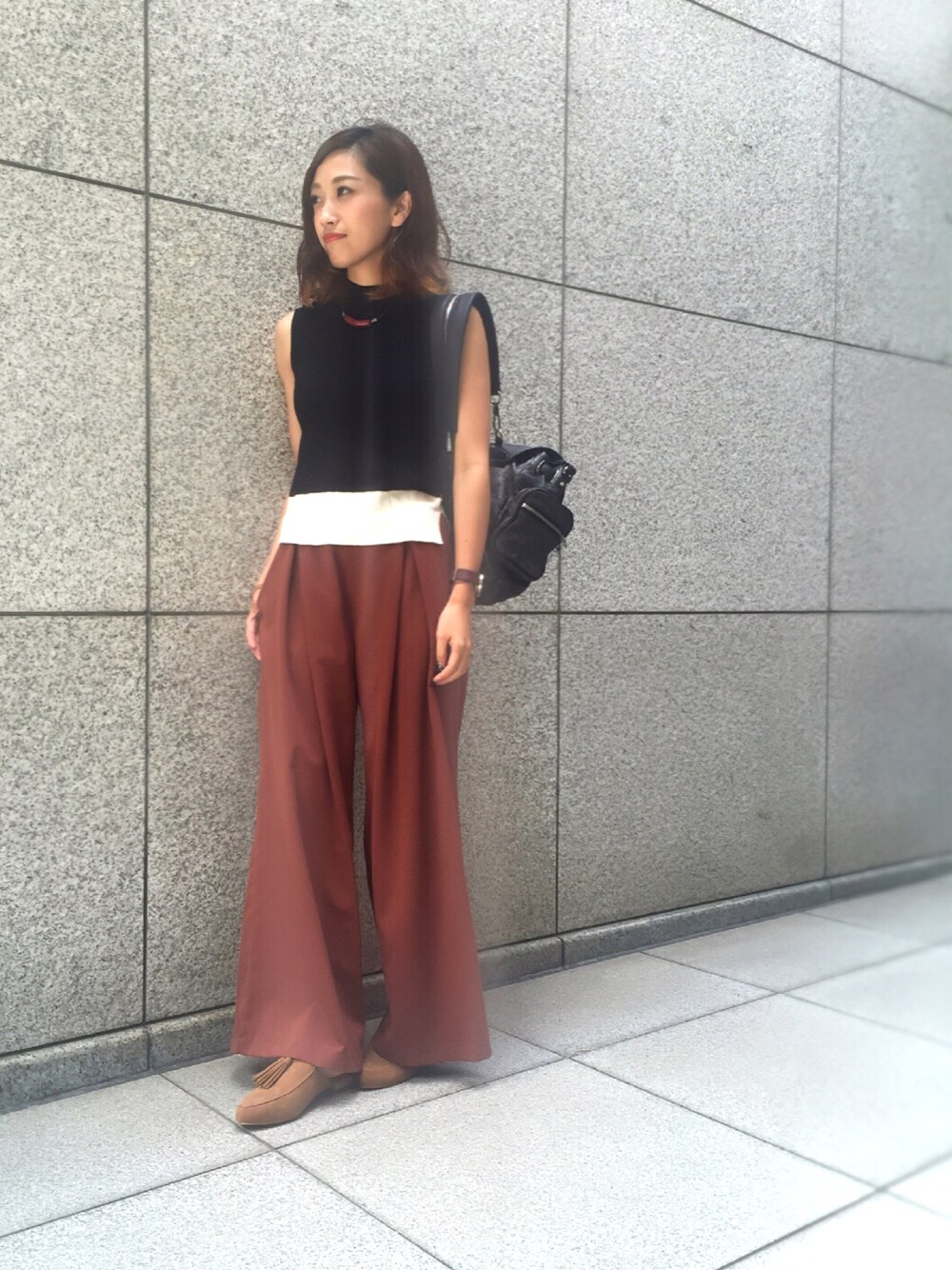 トレンドのテラコッタカラーを主役に! ノースリーブニットは、ワイドリブで今から着やすい1枚です♫ 秋カラーを意識したおすすめコーデ!