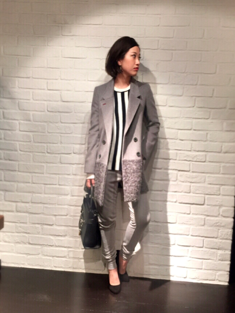 グレーのコートを主役に、こなれOLスタイル☆ ニットパンツで抜け感を出しつつ、黒小物でクールにまとめました!
