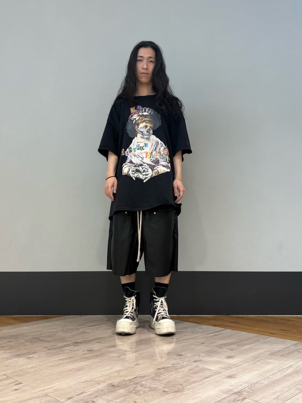 Tシャツで隠れてますがフロントにジップがあるPUレザーショーツ!