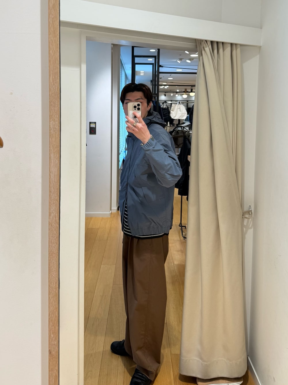 軽くて機能性のある羽織ものは季節の変わり目に大活躍間違いなしですね、襟元はフードが収納されているのでコーデや天候に合わせて対応できます! ナイロンのアイテムは頑張ってないけどこなれて見える優れものです! パンツもシルエットが調子いいので是非見られて下さい!