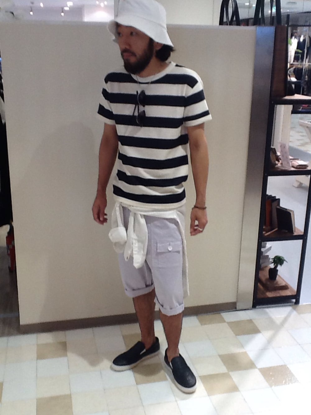 暑い夏はこれで決まり! 定番ボーダーは ビックシルエット ボトムはコンパクトにショーツを・・・ シャツの腰巻と バケットハットを お忘れなく^_^