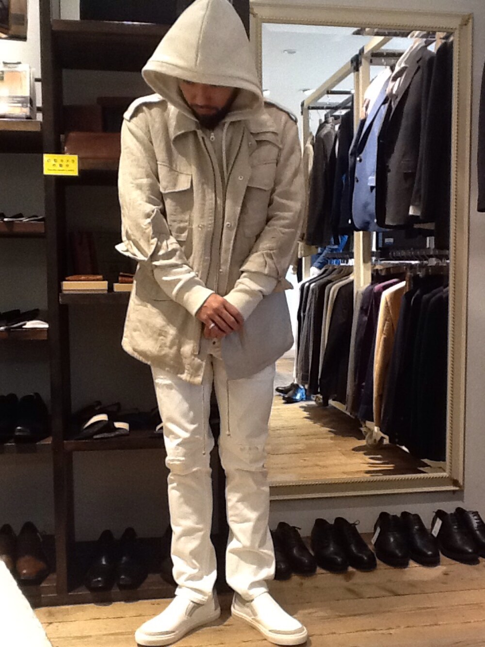 ホワイトをカラーテーマにスタイリング! アウターのアイボリーをアクセントに!! 春らしスタイリングの中に遊び心を盛り込んでみました。