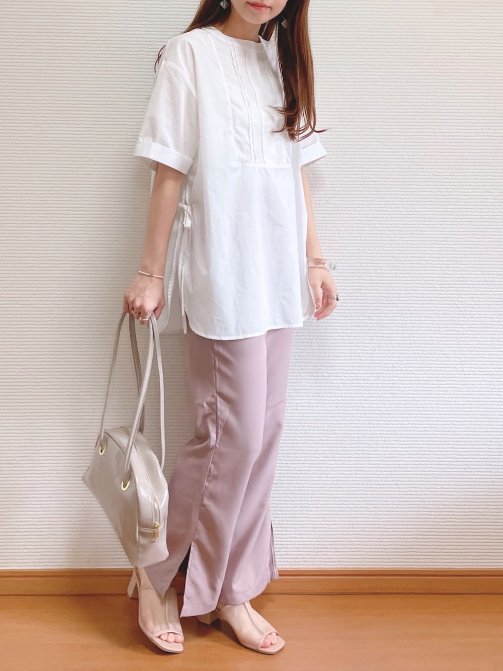 見てくださりありがとうございます♡ しまむらのバンドカラーシャツ👕 形がカジュアルでどんなコーデにも合いそう💓 サイドにリボンがついていて可愛い🥺♡ apres jourさんラテカラーフレアパンツ♡ 脚を細く長く見せてくれる優秀パンツ⁺˳✧༚ 落ち着いたピンクカラーでお気に入り😌💗 いつもいいね、お気に入りありがとうございます♡ フォルダインもとても嬉しいです♡ 気軽にフォローしてください♡ Instagram ⇨ @chaa_nako🌼