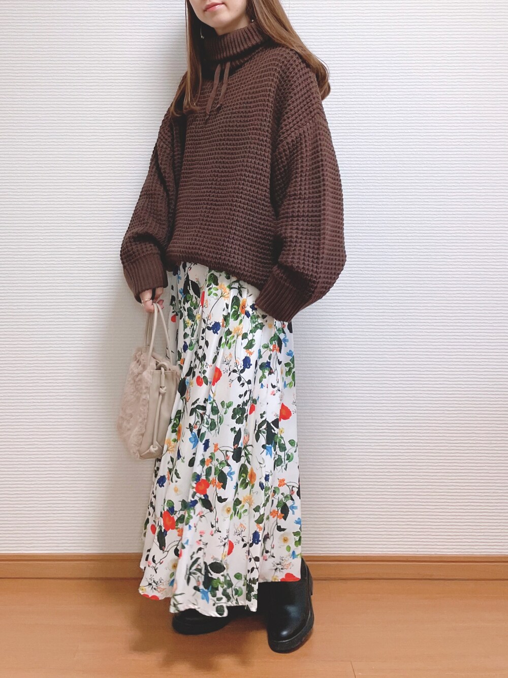 見てくださりありがとうございます♡ NOISE MAKERさんボタニカル柄スカート さらりとした素材で季節問わず履けるスカート♡ 鮮やかで上品なお花のデザインが大人っぽいです💐 コーデの印象を一気に華やかにしてくれます🥺❤️ ボリューム感のある ワッフルタートルニットと合わせました🧶 いつもいいね、お気に入りありがとうございます✿ フォルダインもとても嬉しいです𖤐⠜ 気軽にフォローしてください♡ Instagram ⇨ @chaa_nako