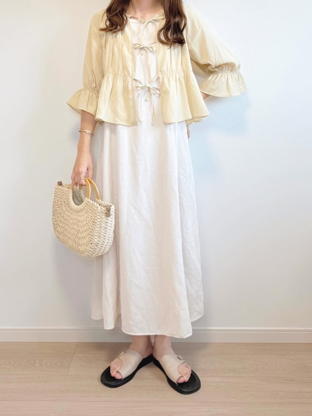 久しぶりにガーリーなコーデ🌷 リボンブラウスとワンピ合わせたら めちゃくちゃ可愛かった🥹👗🎀💛 一番上のリボンの位置片寄っちゃったけど これはこれでまた可愛くてすき。🎀♡ 笑