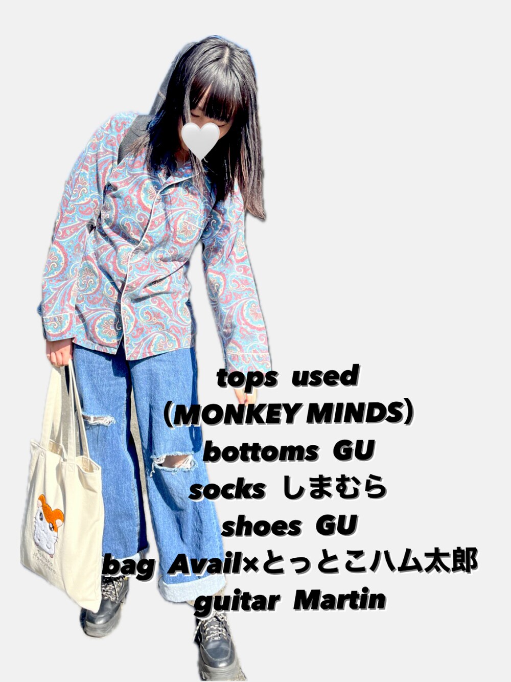実はギター背負ってます🎸 とっとこハム太郎は世代すぎて即買いしました🐹 あ、しまむらやったかもしれません… そしてtopsはパジャマルックの古着😎 ペイズリー柄に一目惚れです✌️