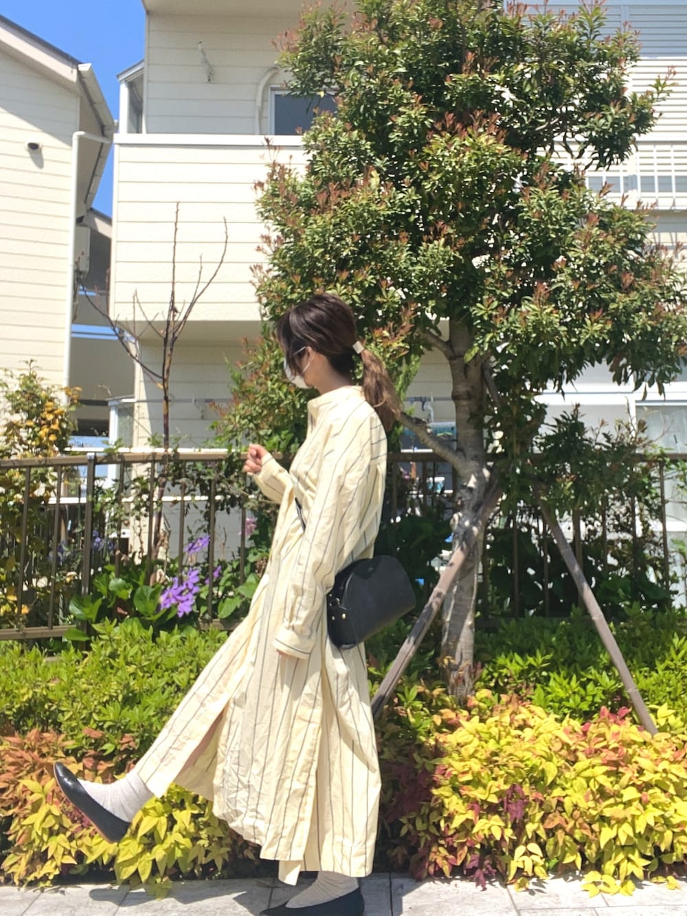 ノーカラーシャツワンピース イエローカラーで春らしく とても可愛くて一目惚れ◎ やっと今日は1日中晴れ模様〜〜