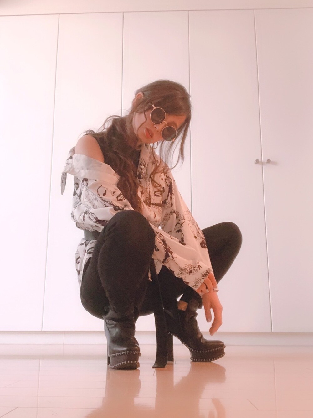 こんにちは💓 一目惚れのモンローシャツ🥰 最近春色の服を着てたけど やっぱり黒が大好き🥺 モノトーン大好き💓 これに黒ライダース×黒キャップ サイコーぅ💕