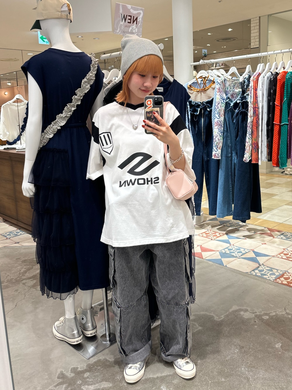 『ユニセックス 切替フットボールTシャツ』 ゆったりとしたシルエットでとても着やすい です! 流行りのスポーツMIXコーデにもってこいの アイテムです! 『ユニセックス ヴィンテージライクフォースカーゴワイドデニムパンツ』 色落ち具合といい形がめっちゃかわいいです! 153cmでMサイズをロールアップして履いてます! よりジャストのサイズ感で履く場合はベルトを つけるといいです!