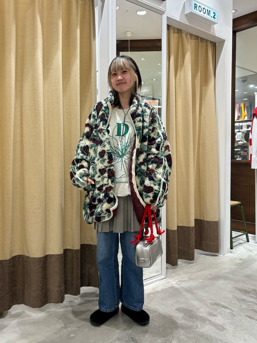 『オーバーサイズ総柄ボアジャケット』 軽くてとってもあったかいです! お尻まですっぽり隠れます! 『BDFフラワー刺繍スウェット』 薄めなので春なら一枚でも着れます! 大きめなのでゆったり着れます! 『プリーツミニスカート』 スカートとして履いてもかわいいですし パンツをレイヤードして履いてもかわいいです!