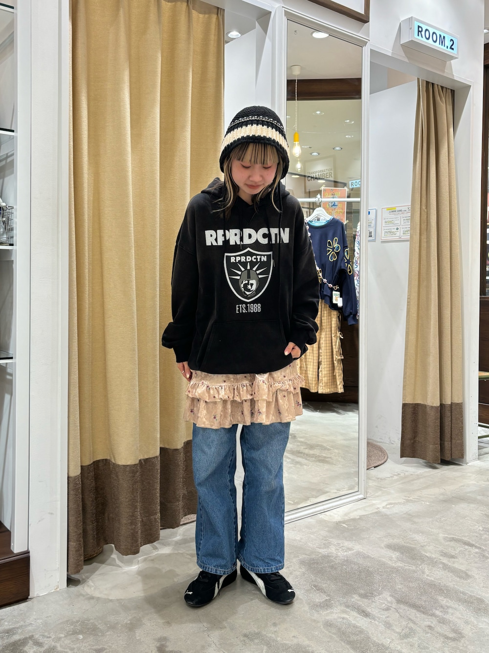 『RePRODUCTIONLABEL ビッグロゴフーディー』 色褪せ加工やダメージ加工が古着好きには たまらないデザインです! ゆるっと着れるのでめちゃめちゃ着やすいです! 『ベロアフラワーキャミチュニックワンピース」 上からスウェットを着るとフリル部分が見えて かわいいレイヤードコーデが楽しめます!