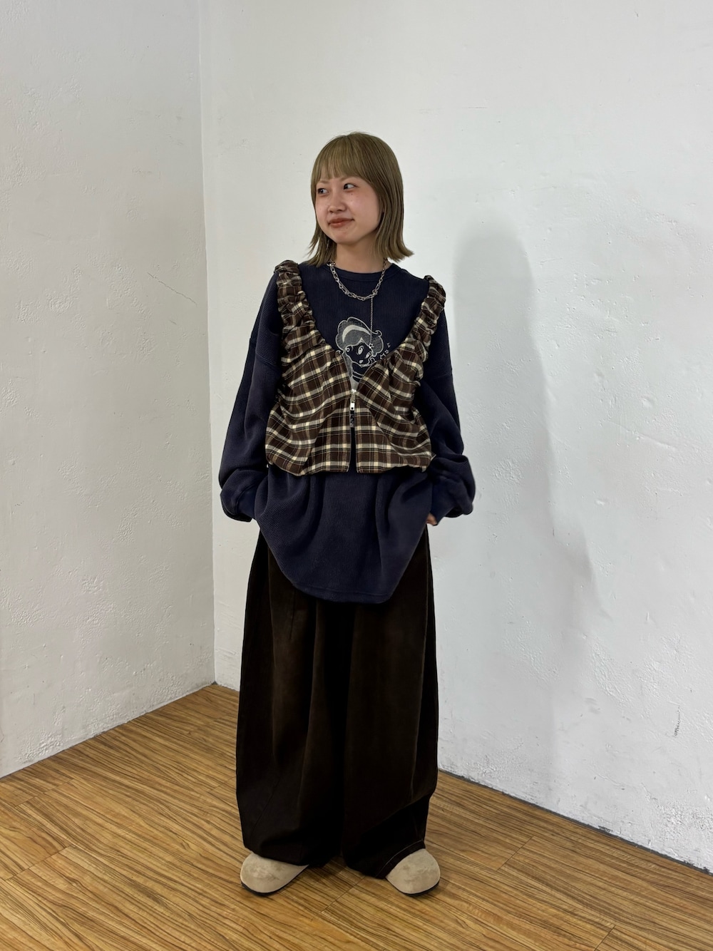 『フェードクルーネックサーマルロンT』 ユニセックスアイテムなのでオーバーサイズで 着れます! 薄手なので夏以外のシーズン着ていただけ ます! 『シャーリングチェックジップベスト』 重ねるだけでコーデにメリハリがつくので スタイルアップして見えます! 腕周りが広めなのでトレーナーや大きめの トップスに重ねれます! 『オーバーダイスーパーワイドカーブデニム』 ウエストはゴムで紐で調節可能です! ゆるっとカーブシルエットなのが とてもかわいいです!