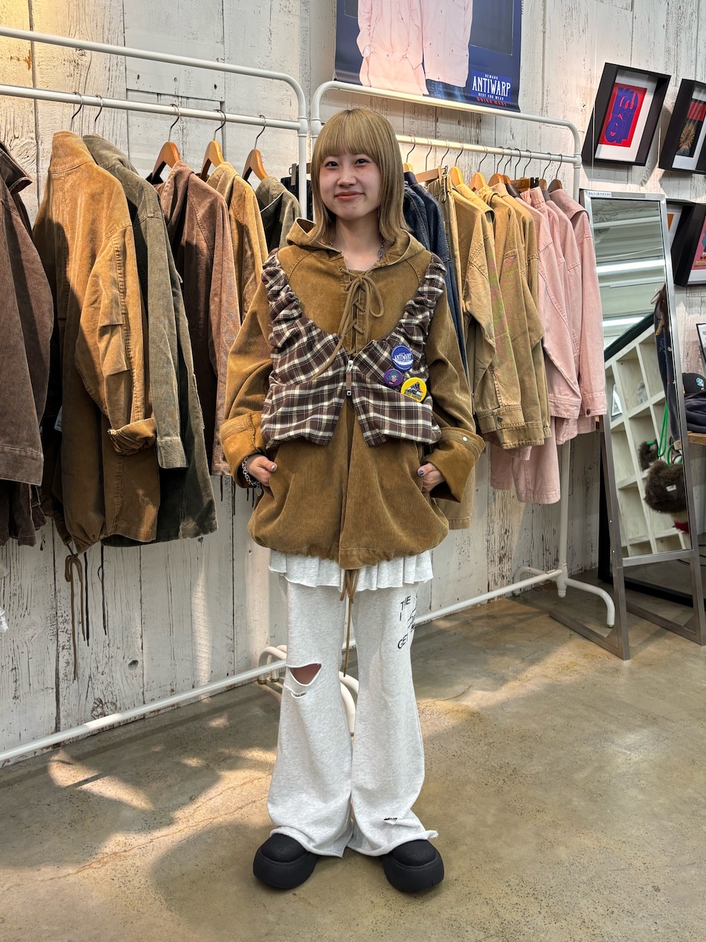 『シャーリングチェックジップベスト』 重ねるだけでコーデにメリハリがついて スタイルアップして見えます! 腕周りが広めなのでトレーナーや大きめの トップスに重ねれます! 『プリーツスカートレイヤードロゴスウェット パンツ』 ウエストゴムで楽ちんです! 裾が切りっぱなしになってたりダメージが 入ってるのがとてもかわいいです!