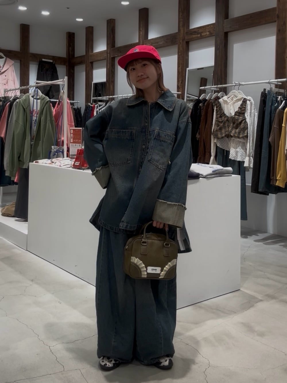 『オーバーダイデニムBIGジャケット』 大きめなサイズ感がとてもかわいいです! 古着っぽいダメージと色褪せ感がとてもかわいいです! 『オーバーダイスーパーワイドカーブデニム』 ウエストゴムで紐で調節で着るので楽ちんです! 軽くて着やすいのでおすすめです!