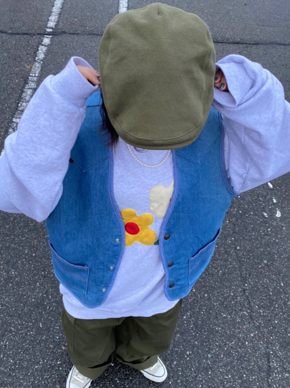 スウェットもオーバーサイズでお花可愛いし、古着屋さんで買ったデニムベストも可愛いし、カーキの帽子とパンツとコンバースも可愛い💓