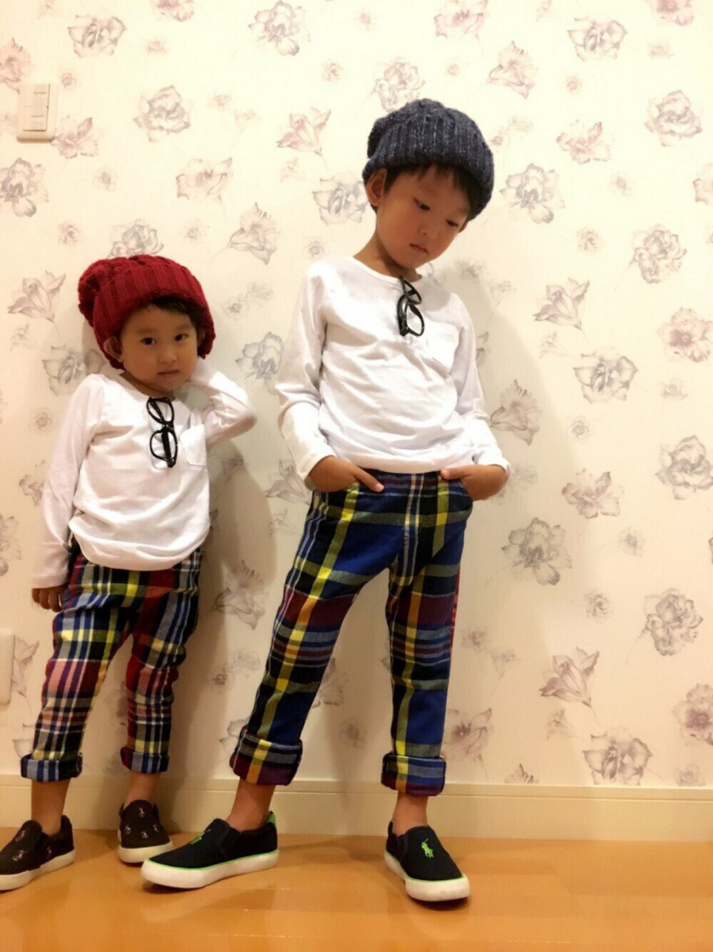 見て頂き、ありがとうございます😊 いいね、コメント、save、フォロー、とっても嬉しいです💕 今後共、よろしくお願いします😘 今日は、チェックパンツコーデ💕 弟くん、ニット帽、大きすぎっ(笑)😆