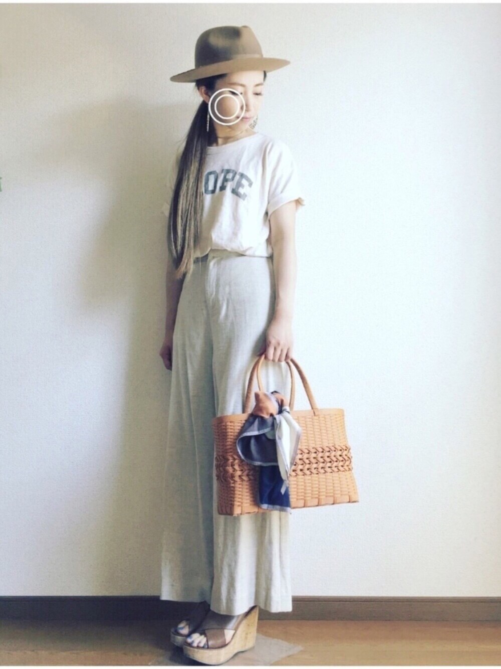 夏らしくリネン素材のパンツに色味の似ているTシャツを合わせました◎ 小物はベージュで統一🌱 ちょっとさみしかったので籠バッグにスカーフを巻きました*/