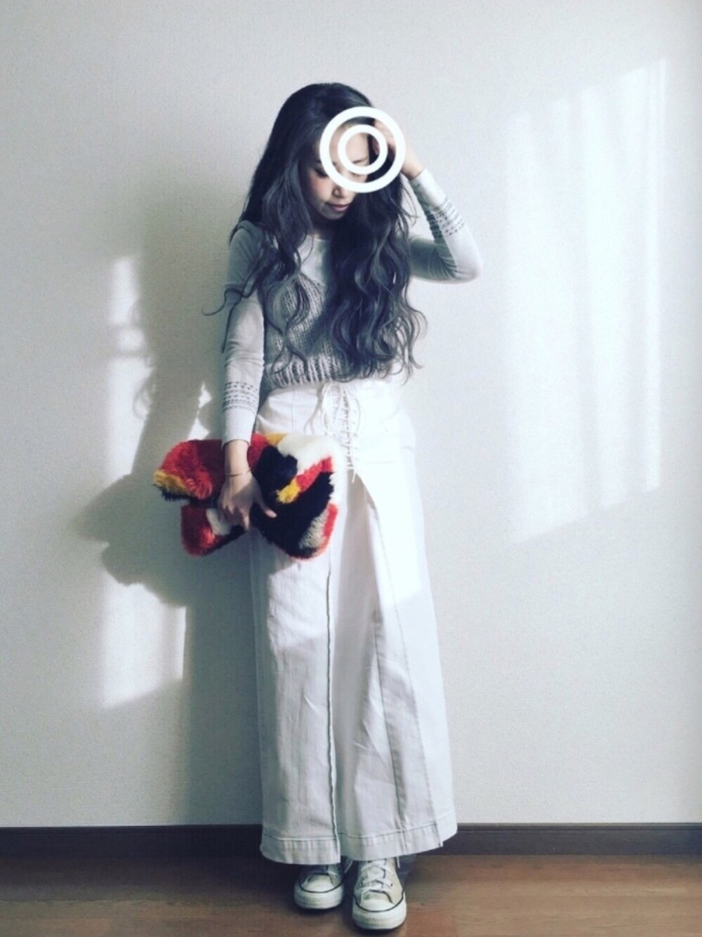 スカートのくすんだ白が可愛い○* ニットビスチェはハンドメイドです🌿 かなり太めの毛糸で編んであります。 暖かいです◎ バックはカラフルなファークラッチを持ちました*/ 季節の変わり目は、何色とも言えないような中間色が好きです。