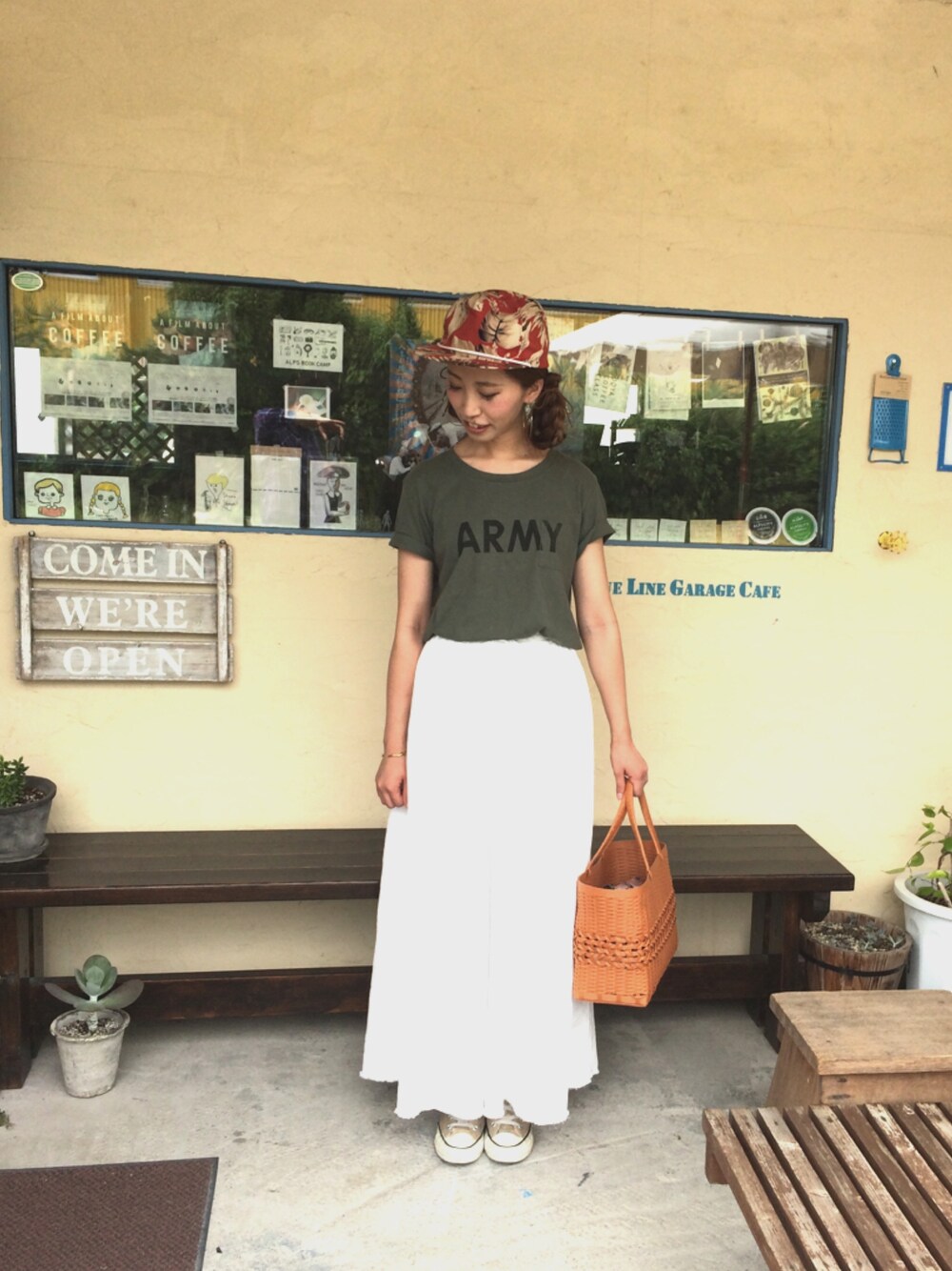 母とランチに行ったときの🌻 カーキに白のスカートを合わせて、お気に入りのハンドメイドの籠バックを持ちました○* 秋服着たいけど暑くて無理です😵 暑すぎてスーパーロングを切ろうか悩み中。。💭