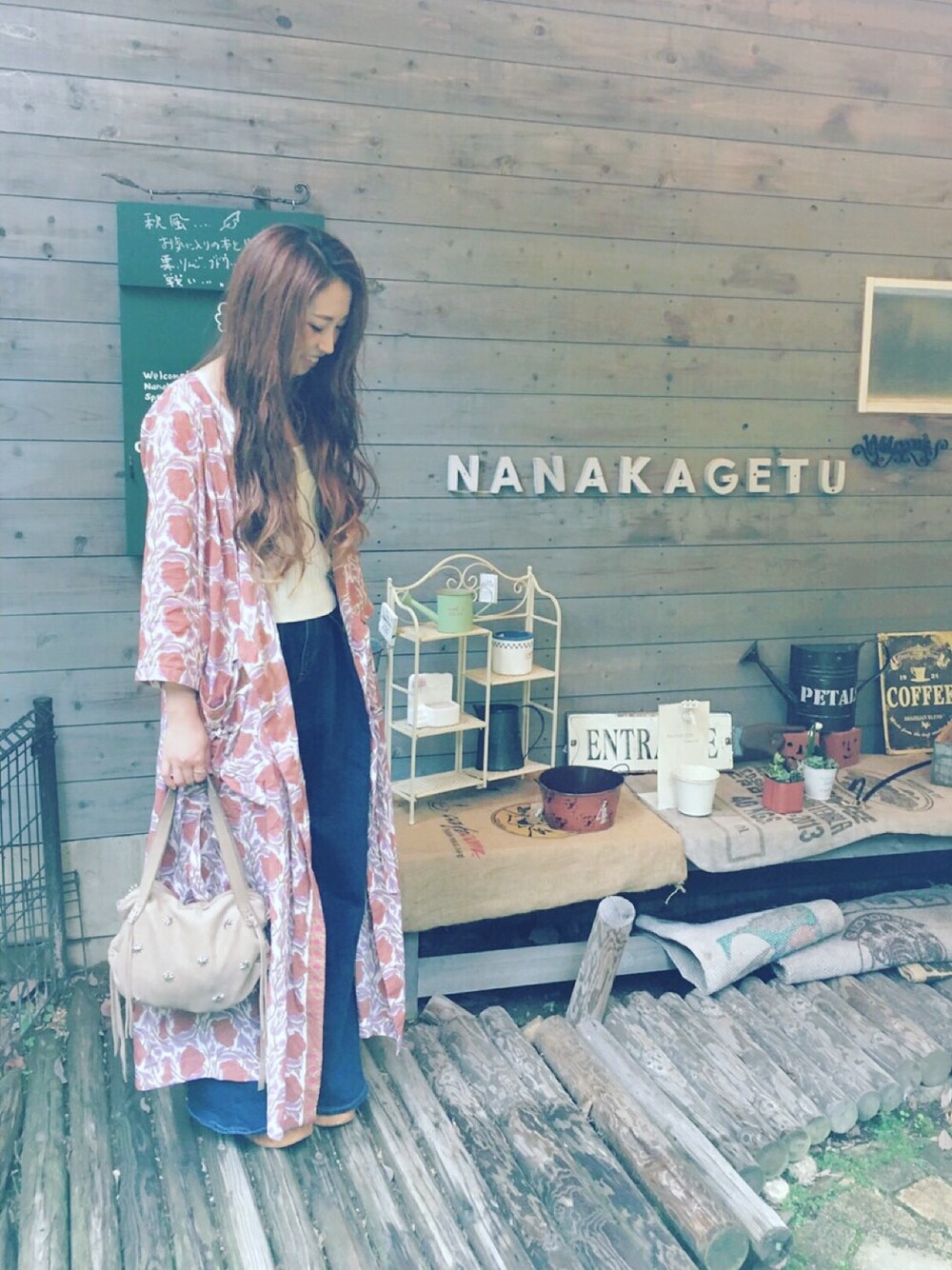 お気に入りのカフェで穏やかな休日🌿 夏に購入したオオシマレイの花柄ガウンは秋🍁も大活躍♡ デニムとの相性が◎