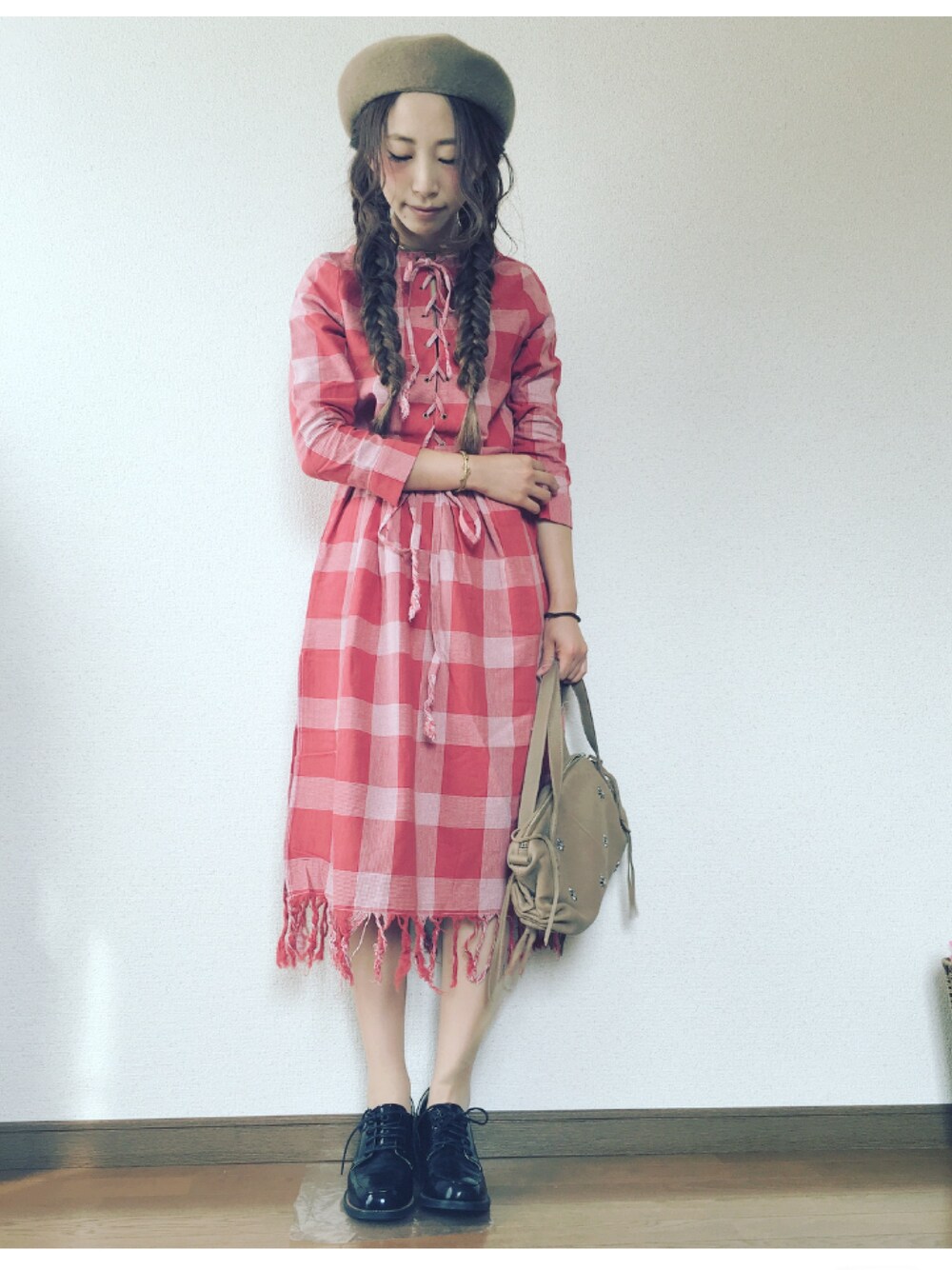 ワンピースを主役に○* 春夏のものだけど、ベレー帽とローファーを合わせて秋仕様にしました🍁🍂🌾 髪はフィッシュボーン◎