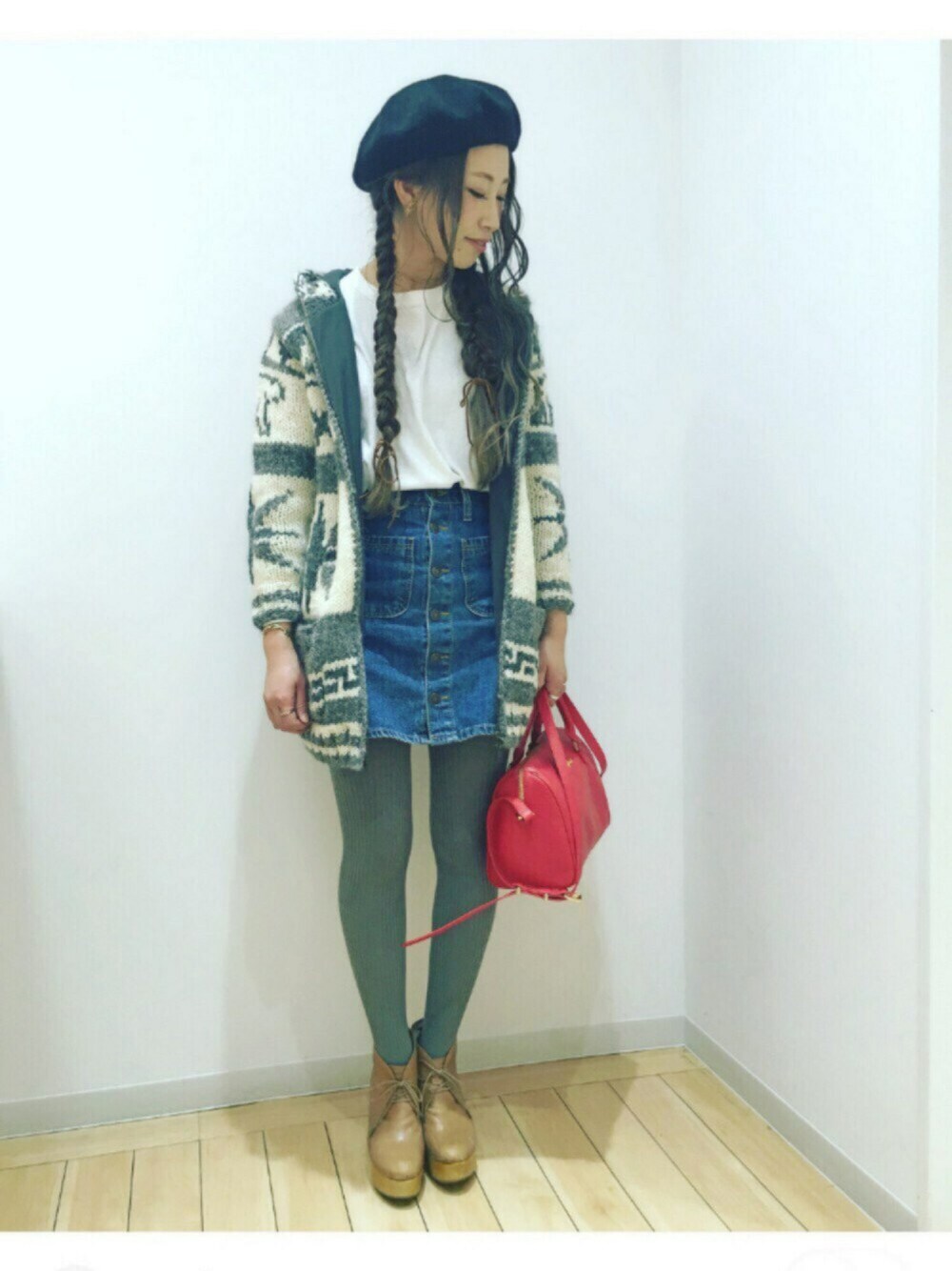 秋はパンツが多めだったけど、冬はタイツの色や柄合わせもたのしみたいな〜* デニムにグレーのリブタイツの合わせが好き◎ カウチンは、inpaichthyskerriのもの* 中に裏地もしっかりついてる丁寧な一枚です^^/// 髪はフィッシュボーンと三つ編みで左右ばらばらにしました。革紐をリボン代わりに* お気に入りのmuveilのバックを持って 大好きな人とランチへ〜😚🍁