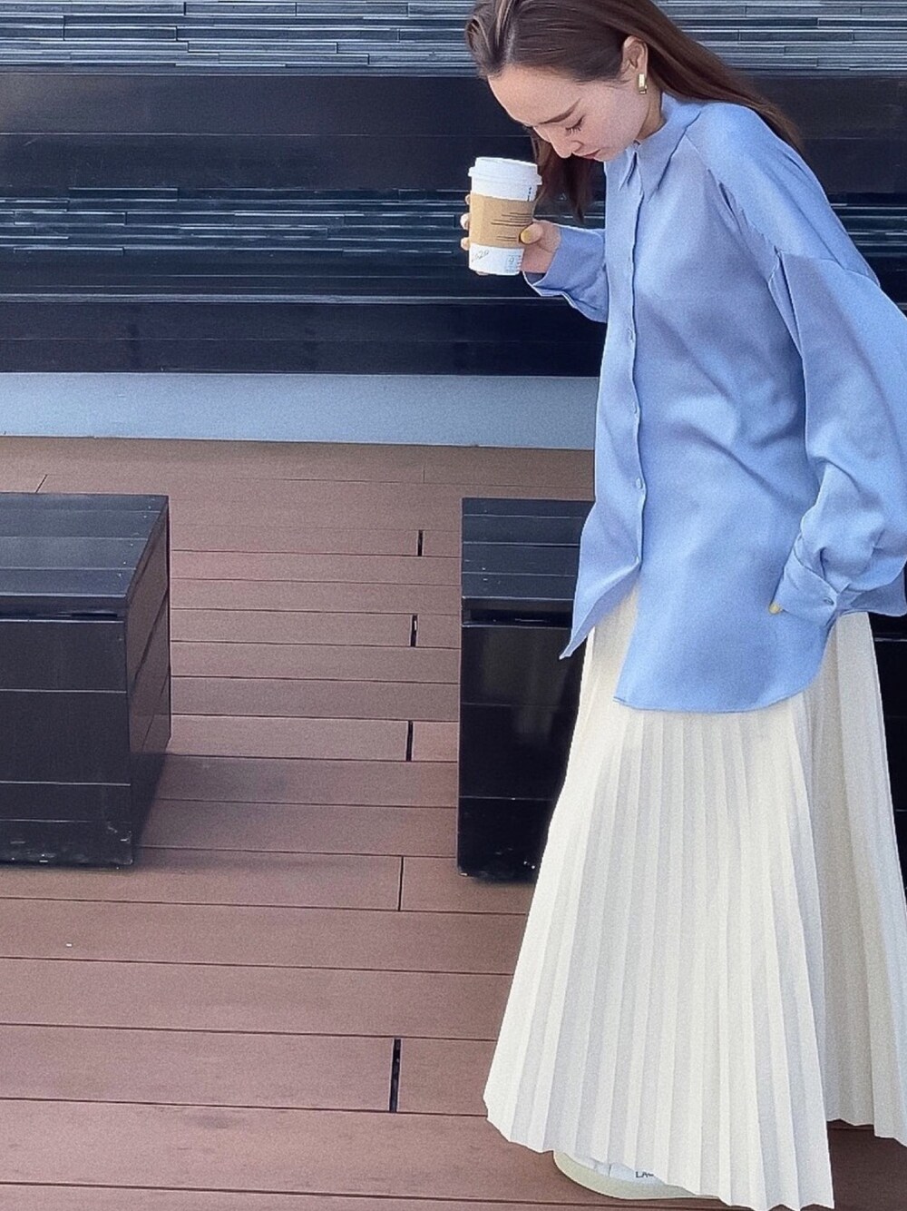 ブルー系のシャツ/ブラウスを着用したレディースの春コーディネートの1枚目の写真