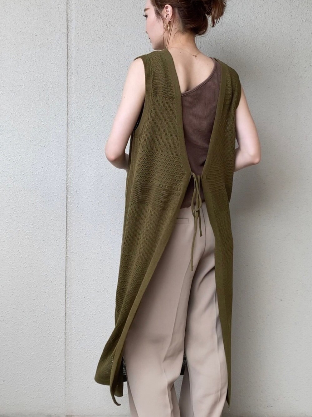 ブラウン系のタンクトップを着用したレディースの夏コーディネートの1枚目の写真