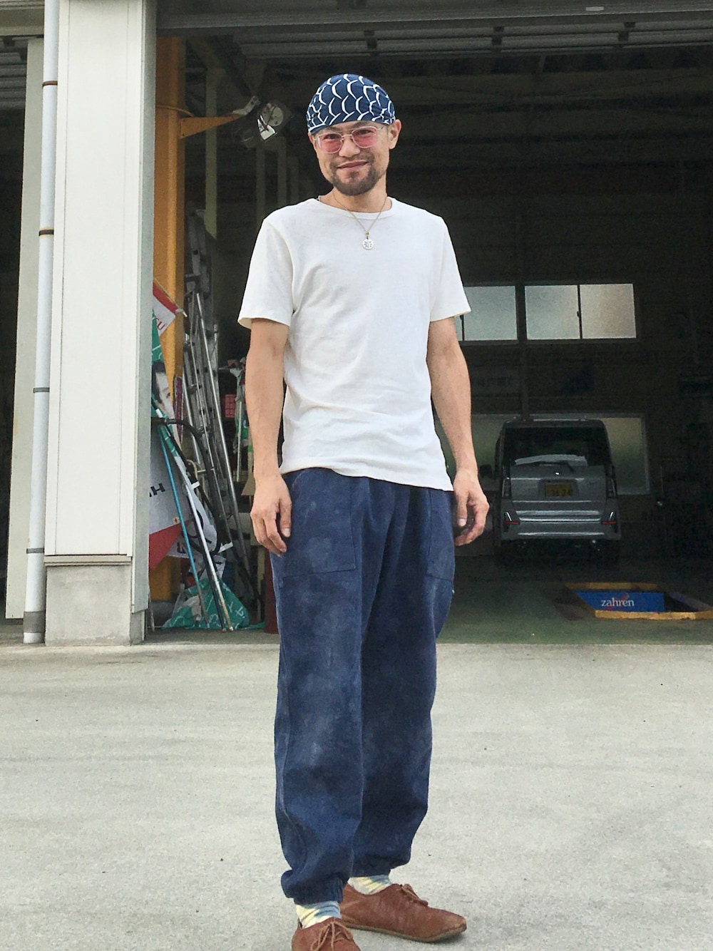 今日の装備 E:アロワナの手ぬぐい E:ヘンプコットンの白T E:旅人の百姓袴 E:パンみたいな靴