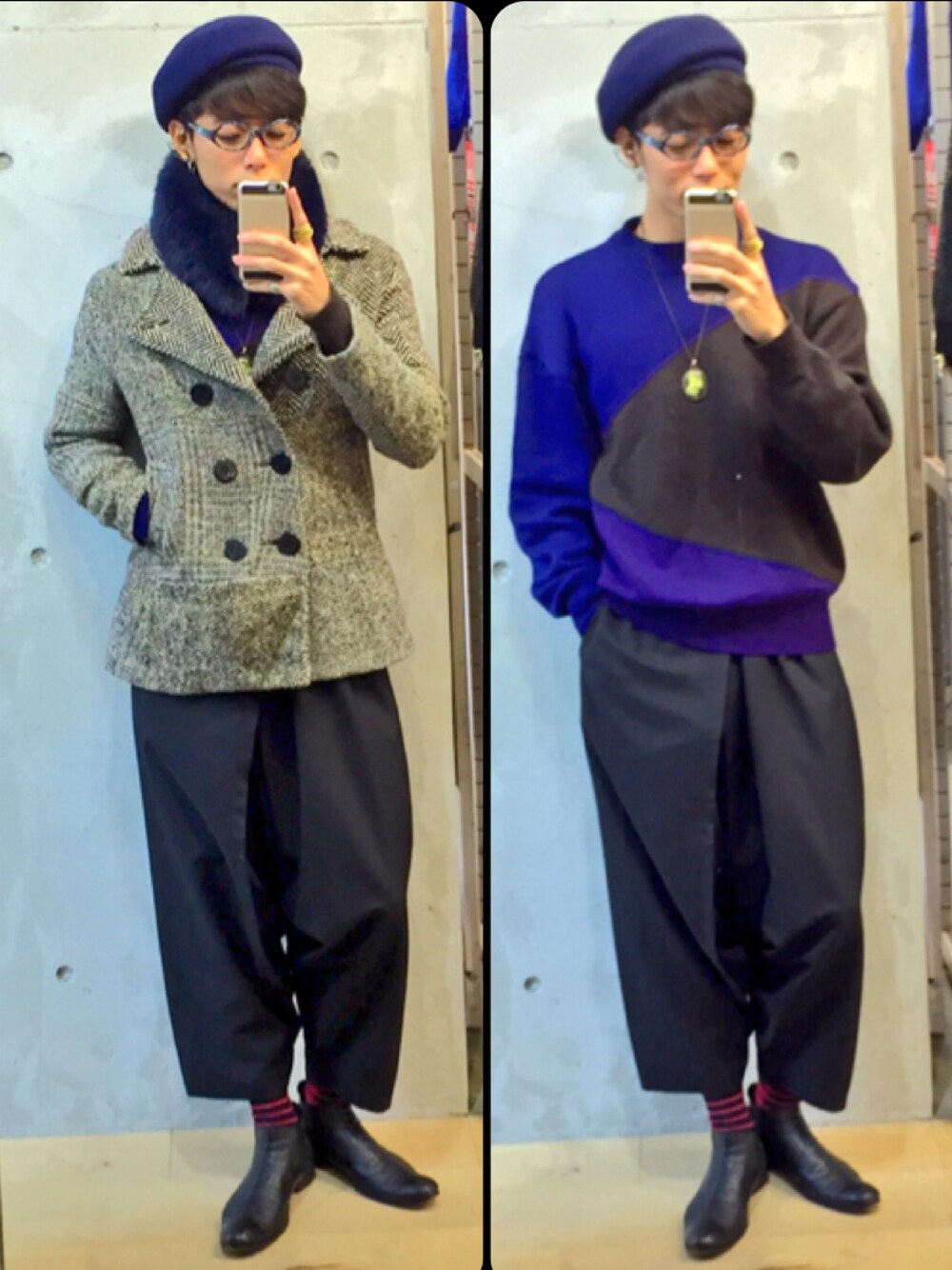 いつもご覧いただきありがとうございます! 今日は北風が非常に冷たいので 晴れてても防寒しないとですね アシメ切替ニットに変形サルエルで中を遊び ハリスのピーコートとブーツで外は渋くシックに テーマは… "アクセサリデザイナーのアシスタント" です笑 顔周りに小物をふんだんに使って 可愛いさも取り入れたコーデにしてみました モードな雰囲気の着こなし以外では 結構好きなスタイルです イヤリングで愛用してるS.nakabaの デザイナーである中場信次さんをイメージして アランミクリの菱形メガネにS.nakabaの作品を