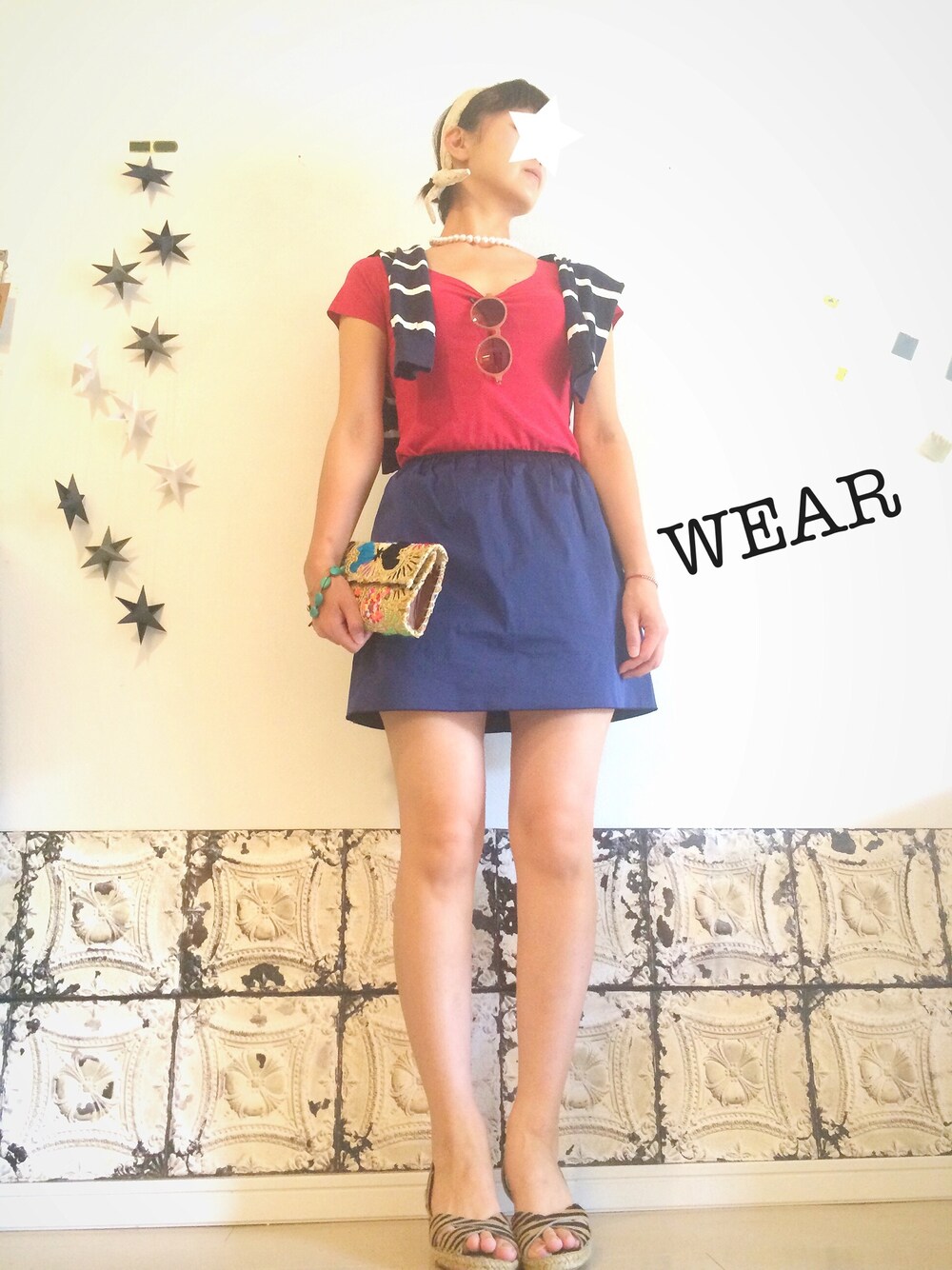 Classical style blue*red Tops-lunch Stripe knit-Deuxiemé Classe Skirt-Adam et rope Clutch bag-RonHerman Sunglass-vintage Necklace-grün