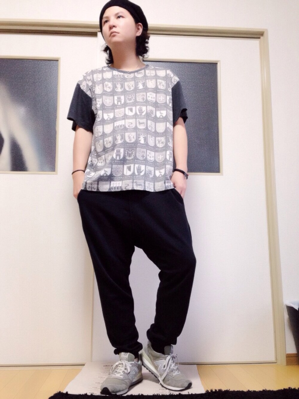 アドバンテージサイクルのTシャツにスエットパンツ。モノトーンでまとめました。