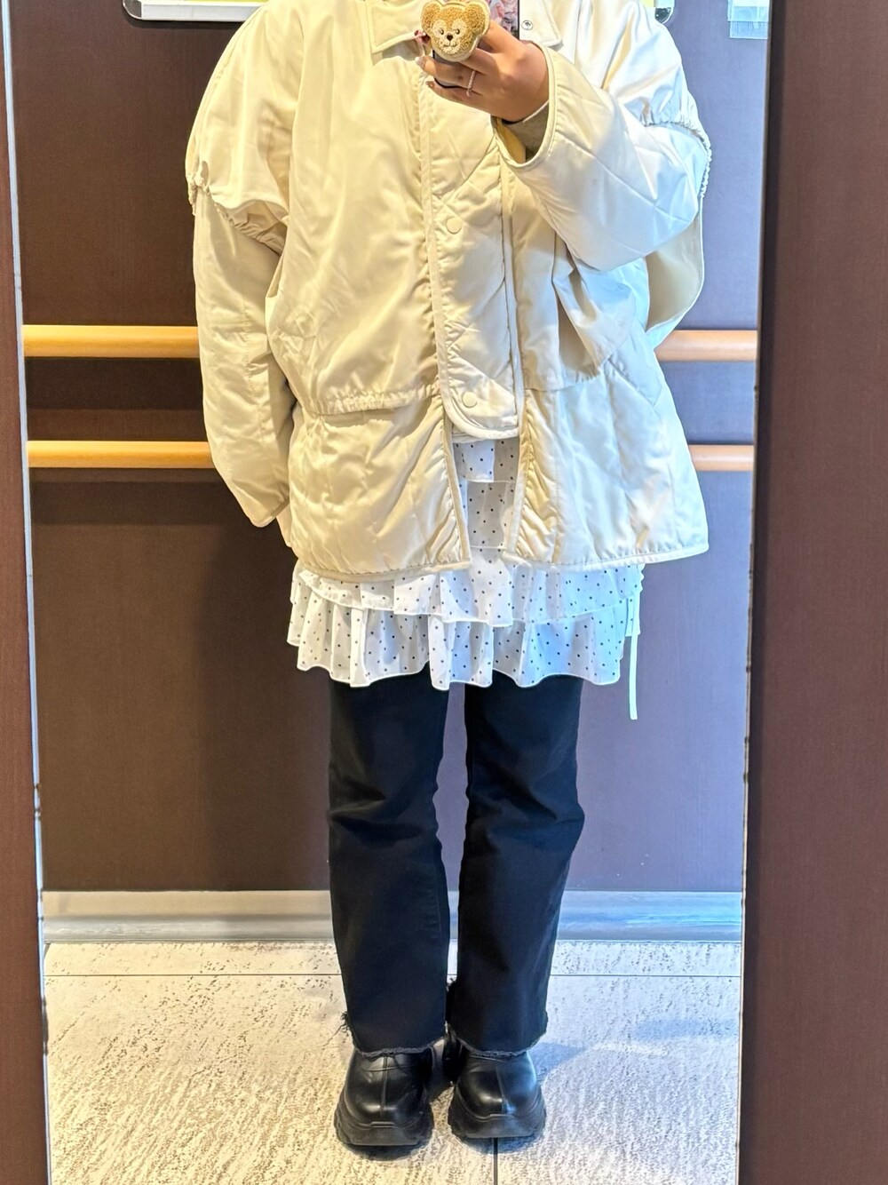 ドットのフリルをボトムスの上に重ねることでさり気ない着こなしができる🤍