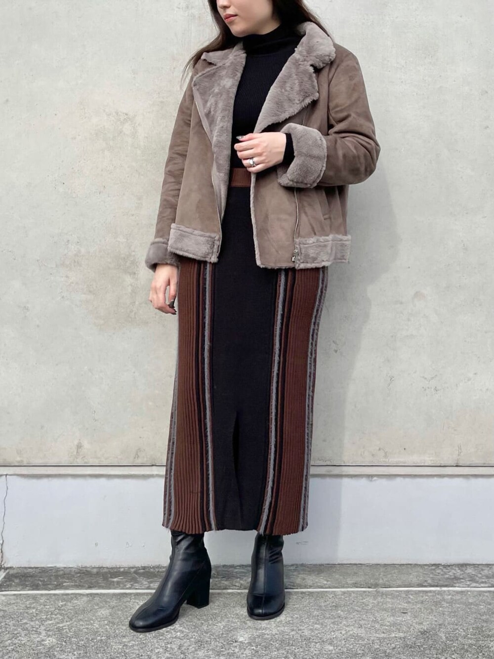 ムートンライダースは柔らかい生地感で綺麗めな雰囲気のコーディネートに合わせていただきやすいです♡ 中は全体がファーで暖かく、軽く着ていただけます。 ニットスカートは配色がアクセントになって一枚で可愛いアイテムです♪ タイトなシルエットですが、前スリットで歩きやすいですよ☺︎